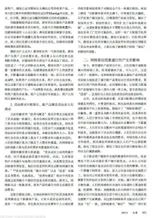 【摘要】"网络移民"是随着互联网信息技术的发展产生的一个新名词,文章以传播学的视角,从媒介特征、内容要素、受众需求等方面分析了网络移民现象产生的原因,探讨了网络移民现象对新媒体行业、受众行为方式所产生的影响,对于当前新媒体产品的研发应用和受众行为研究有一定参考作用。