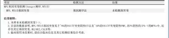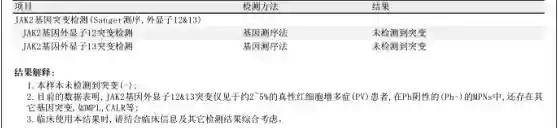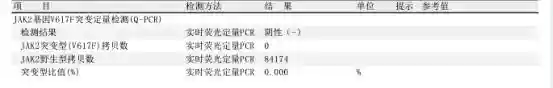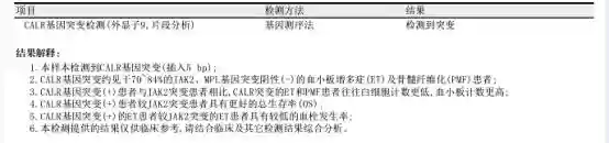 5、分子病理结果示:1.本样本检测到CALR基因突变(插入5bp);2.MPLW515基因未检测到突变;3.JAK2基因(Sanger测序,外显子1213)未检测到突变;4.JAK2基因V617突变定量检测(Q-PCR),实时荧光定量PCR阴性(-)。