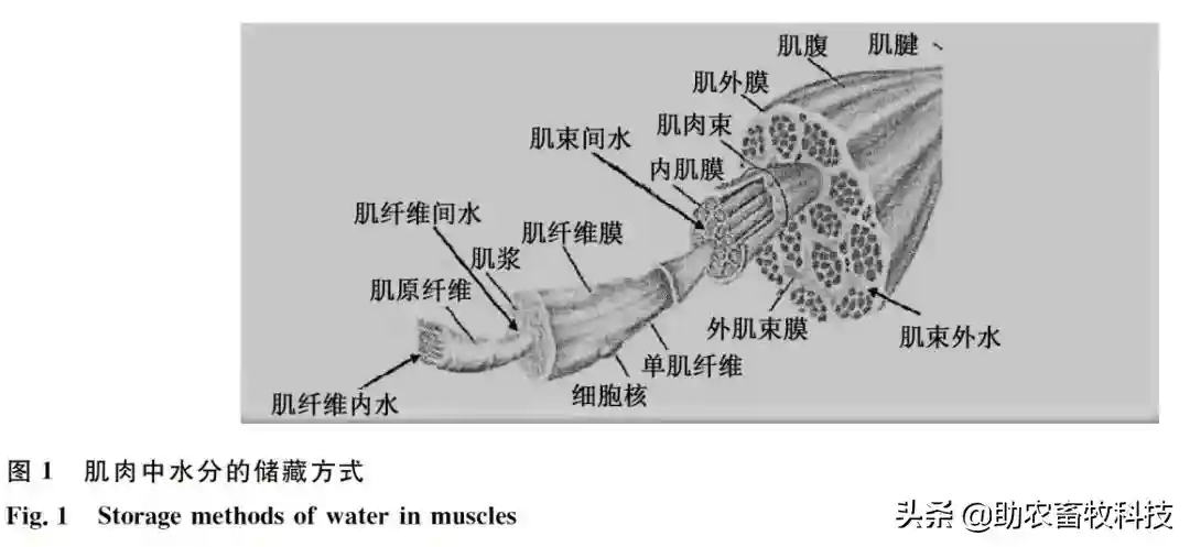 系水力是肉类保持其水分的能力,肌肉中的水分主要以结合水、不易流动水和自由水3种形式存在,储存在不同的空间结构中,主要存在于肌原纤维内、肌纤维间、肌原纤维及肌束间(图1);
