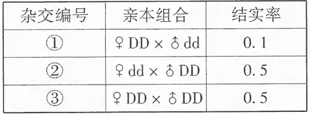 (5)进一步研究表明,配子育性降低是因为D基因失活直接导致配子本身受精能力下降。若让杂交①的F1给杂交②的F1授粉,预期结实率为,所获得的F2植株的基因型及比例为。