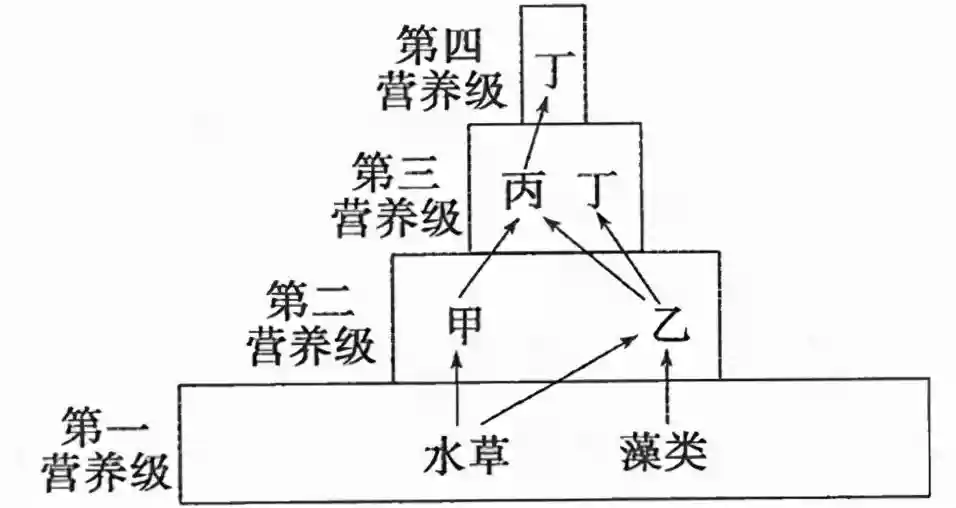 D.图中甲和乙属于同一个种群,而处于第三、四营养级的丁属于不同的种群