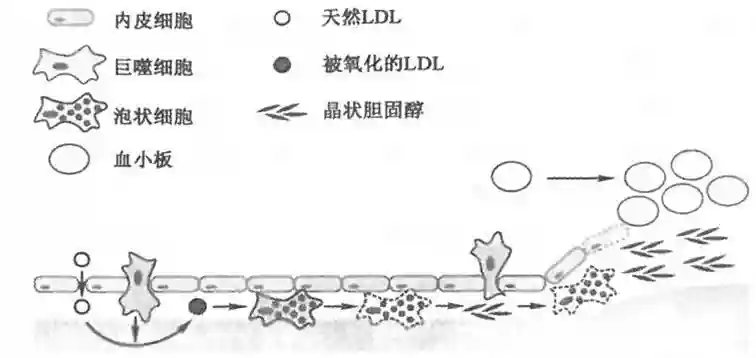①在动脉血管的某些区域,LDL透过血管内皮沉积在血管壁中,引来氧化LDL并大量吞噬后转化成为泡状细胞,泡状细胞死亡后释放出积累的胆固醇。释放出的胆固醇形成晶状胆固醇沉积物,并激活新的巨噬细胞,导致其释放出炎症因子,诱发和放大炎症反应。